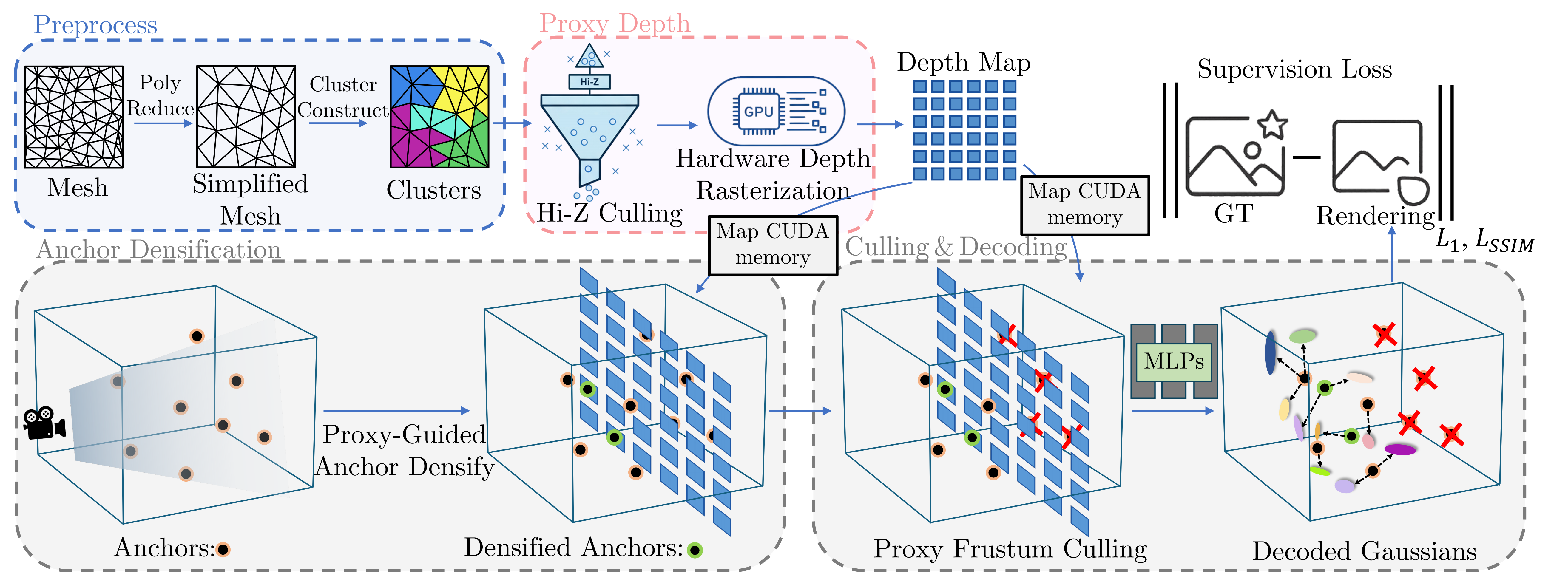 Compared to existing baselines, Proxy-GS enables virtually cost-free depth-based occlusion culling, which in turn significantly reduces the overall rendering time in large scenes with heavy occlusions, while introducing no additional burden in smaller or less-occluded environments.