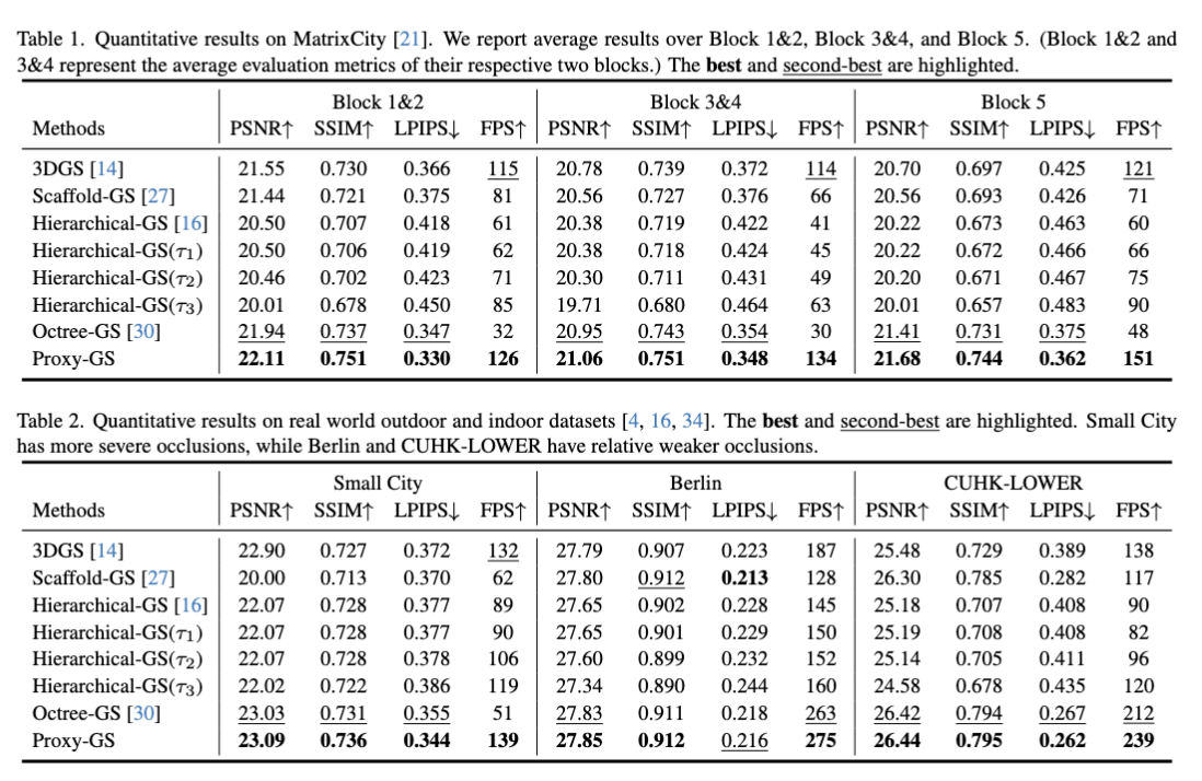 In the City Street scenes, Proxy-GS achieves stable real-time rendering while preserving fine-grained visual details.